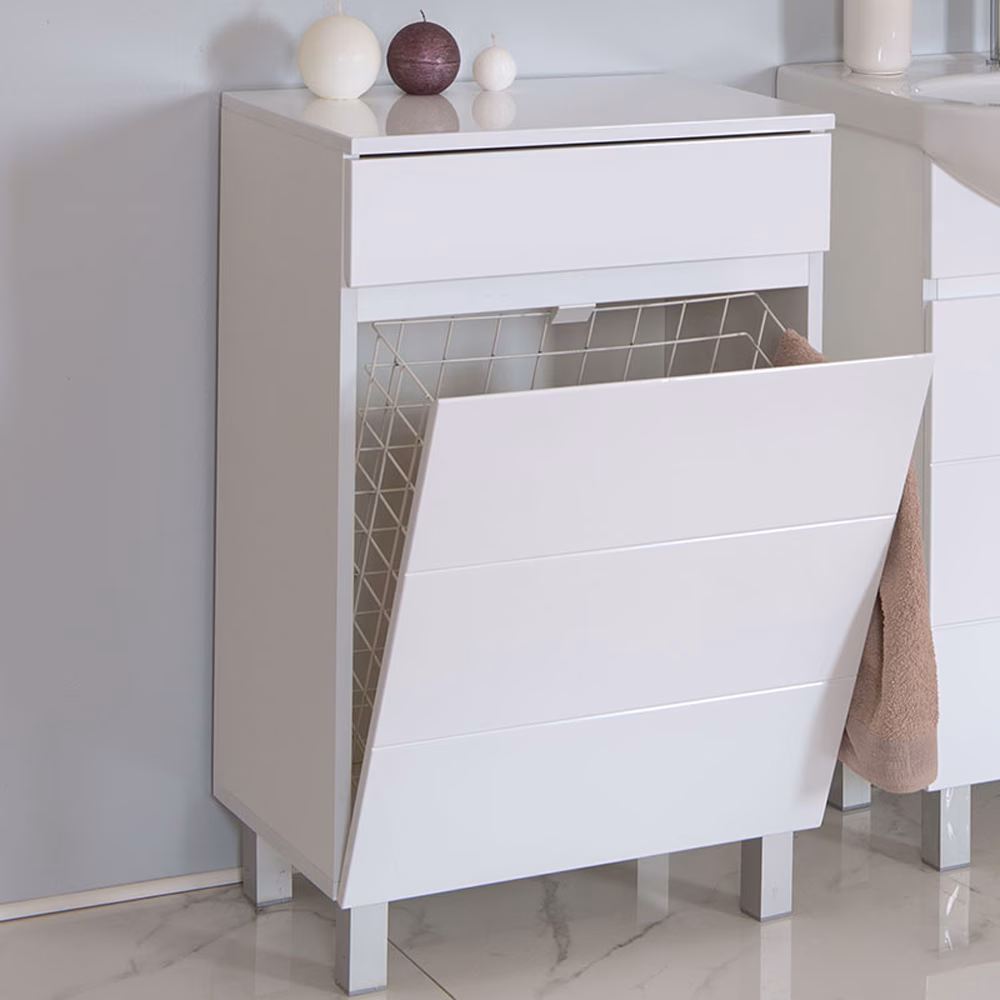 • Materijal izrade: stranice od oplemenjene iverice i front od medijapana, ofarban poliuretanskom bojom,žičana korpa, šarke sa usporivačima