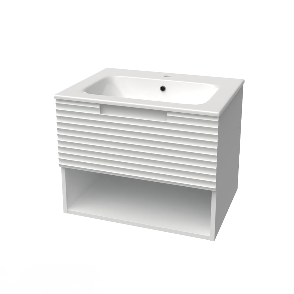 • Lavabo sa ormarićem od pločastog medijapana u beloj boji, front sa trodimenzionalnim horizontalnim reljefom