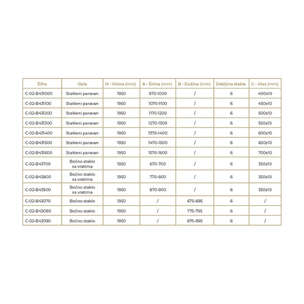 • Visokokvalitetno kaljeno staklo (6 mm) – Pruža sigurnost, otpornost na udarce i dug vek trajanja